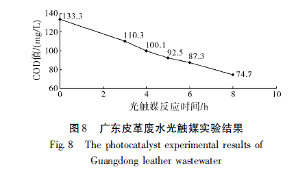 从图8可以看出,原水COD值为133.3mg/L。随着光触媒反应时间的延长,COD呈直线下降的趋势。当反应时间为4.0h时,COD值降至100.1mg/L;当反应时间为8.0h时,COD值降至74.7mg/L。