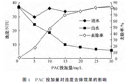 浊度的去除效果随PAC投加量的变化见图4。当PAC的投加量从0增加到15mg/L时,浊度去除率呈明显的上升趋势,投加量为15mg/L时,去除率达70.7%,出水浊度为9.9NTU。PAC投加量继续增加时,去除率曲线趋于平缓,当投加量为30mg/L时,浊度的去除率为84.1%,出水的浊度在6NTU以下。