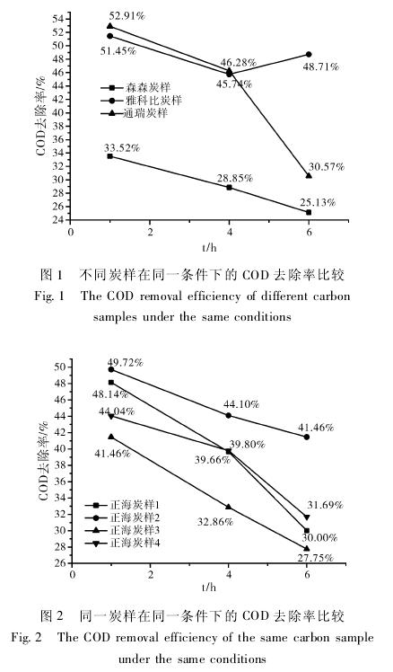 图1描述了不同炭样分别在1h、4h、6h后对水中有机物的去除率呈递减趋势;图2对同一炭样做4次平行实验,在1h、4h、6h后对水中有机物的去除率也是呈递减趋势。图1、图2表明,活性炭的吸附性能随着运行时间增长而下降。