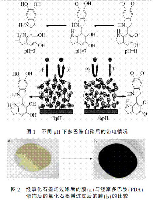 多巴胺(dopamine),一种生物神经递质。2007年,H.Lee等〔2〕从贻贝的黏附蛋白中获得启发,利用多巴胺研究了其在不同有机、无机材料表面的自聚涂覆功能,并成功形成了功能化的改性表面。自此,有关多巴胺在除神经学外的应用报道不断引起人们的关注。基于多巴胺的黏附性、还原性以及生物相容性,多巴胺及其衍生的复合粒子逐渐被用于各个领域,如抗菌〔3〕、催化〔4〕、生物传感器〔5〕、细胞成像〔6〕、膜技术、吸附等。尽管多巴胺具体的黏附机理还不是很清楚,但是科研人员普遍认为,这种性能与多巴胺所含有的邻苯二酚和氨基官能团有关。其中被广泛接受的解释有2种,一种是在不同的pH下,多巴胺自聚后所带电荷不同(见图1)〔7〕,从而使得其所附着的材料表现出不同的功能;另一种是在水溶液中,多巴胺的邻苯二酚基团容易被氧化,生成含有邻苯二醌结构的醌化合物,多巴胺和其醌化合物发生反歧化反应,产生醌自由基,耦合形成交联键,从而在基体材料表面形成紧密附着的交联复合〔8〕。这与随后发现的多巴胺表现出还原性能〔9〕具有一致性。从多巴胺和氧化石墨烯的反应(见图2)可直接观察到,混合了多巴胺的氧化石墨烯经过滤后,颜色变黑,说明氧化石墨烯被还原〔9〕。随着多巴胺在除神经学领域外应用的增多,需对其作用机理进行深入研究,从而使其得到更广泛的应用。