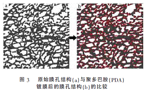 膜处理技术〔10〕因其分离效率高、设备简单、操作方便、无相变、节能等优点,已被广泛应用于石油化工、医药卫生、冶金、电子、能源、轻工、纺织、食品、环保、航天、海运等的废水处理中,其作用不可小觑。而膜材料又是膜技术的核心,因此,弥补现有膜材料使用中易污染、难清洗、寿命短、成本高等不足,提高膜材料的性能,是目前亟待解决的问题。由于表面功能化改性不改变膜本体结构,仅有效改变材料表面的性能,其受到研究者的广泛关注。基于多巴胺的黏附功能,其多被用于材料的表面功能改性。B.D.Mc-Closkey等〔11〕在2010年用多巴胺对膜进行改性,研究了改性后的反渗透膜、超滤膜和微滤膜在水通量和抗污性方面的改变。研究表明,所有膜经过多巴胺改性后,对蛋白质和牛血清白蛋白的黏附减少,说明其抗污性增强;然而,经过改性后,虽然亲水性增强,但是由于膜孔被部分堵塞,其水通量有不同程度的减少。由于经多巴胺修饰后的膜的部分效果可得到增强,研究者对此进行了广泛研究。J.T.Arena等〔12〕用多巴胺对反渗透膜进行表面修饰,研究发现,改性后的膜比未改性膜的水通量可高出8~15倍。从多巴胺改性前后膜的电镜图(见图3)可以看出,改性后的膜孔被适量的多巴胺填充。经多巴胺改性后,膜材料的亲水性增强,从而使得膜的水通量增大,这对其在工程中的应用有很大价值。GangHan等〔13〕的研究表明,聚多巴胺(PDA)镀膜过程对实验结果有很重要的影响。基于前面的研究,S.Kasemset等〔14〕对多巴胺改性中多巴胺浓度、pH、沉积时间等因素对膜水通量、截盐率、油水分离的影响进行了研究,实验表明,膜的纯水通量随着多巴胺浓度的增大、沉积时间的增长而减少;在任意浓度、沉积时间及碱性条件下,其抗油污性都显著增强。综上,多巴胺是很好的膜表面改性材料。由于对于多巴胺改性的机理、最佳工艺条件,以及如何综合提升各种效果还没有切实的研究,因此,距离实际生产应用还有距离。