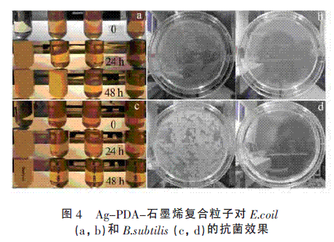 吸附因其易操作、成本低,成为化学工业、石化工业、制药工业的一种重要分离手段。吸附剂的吸附容量、吸附效率以及可循环利用能力是其得以广泛应用的重要考量。基于多巴胺的亲水性以及自身的黏附性,N.Farnad等〔15〕将其制成单独的聚多巴胺纳米粒子作为新型吸附剂移除水溶液中的Cu(Ⅱ)。在碱性溶液中,可通过多巴胺自聚形成聚多巴胺粒子,其平均直径为75nm。吸附试验表明,聚多巴胺粒子移除Cu2+的能力能达到34.4mg/g。可见,多巴胺是很有前景的吸附材料。基于此,不少研究者将多巴胺与其他吸附类材料结合在一起,从而增强了吸附效果。众所周知,活性炭是一种优良的吸附剂,其具有独特的孔隙结构和表面活性官能团,并具有稳定的化学性能,耐强酸、强碱、高压等优点。石墨烯作为活性炭的一种同素异形体,因其独特的平面及超大的比表面积,受到研究者的广泛关注。石墨烯以及基于石墨烯的衍生物已用于重金属离子以及有机染料的去除〔16〕,研究证明,其具有良好的除污效果。综合多巴胺与石墨烯的特性,两者的复合材料已被制备,并用于抗菌〔3〕、催化〔4〕等。图4显示了Ag-PDA-石墨烯形成的复合粒子对革兰氏阳性菌和革兰氏阴性菌的抗菌效果。定性实验表明,形成的复合粒子有很强的抗菌性能,为污水中微生物的去除提供了思路。