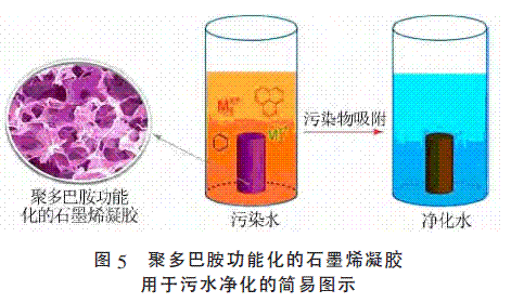 为了方便工业大规模应用,效率高、成本低、易回收的吸附材料一直是研究的重点。在普遍想做精做细的同时,有研究者以逆向思维考虑,把2D的复合粒子转变为3D的复合材料,克服了2D复合粒子难回收的难题〔17〕。gcaiGao等〔18〕将多巴胺与氧化石墨烯进行结合(见图5)形成3D水凝胶,并用于水的净化。由于两者独特的性能,凝胶形成过程简单。吸附实验证明,多巴胺与氧化石墨烯复合凝胶对重金属、合成染料以及芳香族污染物都表现出了很高的吸附能力,更重要的是,污染物被吸附后这种独立的3D结构很容易被回收,而且通过简单的pH调节和乙醇冲洗还可以使3D复合凝胶循环再利用。这不但简便了操作,也大大降低了回收成本,对于实际的工业操作有很大的应用价值。