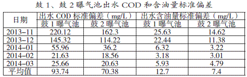 标准偏差主要用于衡量数值偏离平均值的情况,一般情况下,标准偏差越小,说明数值偏离平均值的程度越小,则系统越稳定,通过函数分别将鼓1曝气池、鼓2曝气池的COD标准偏差和油质量浓度标准偏差计算出来,从而对系统的稳定性进行评价。