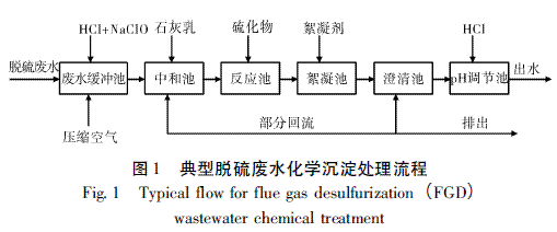 化学沉淀法处理工艺主要是由中和、沉淀、混凝、澄清四个步骤构成。中和沉淀是调节废水的酸碱性,一般使用的碱性中和剂主要有NaOH、CaCO3、石灰等;再向经过了加碱反应的废水中加入有机硫或S2-使铅离子、汞离子等离子形成重金属硫化物沉淀,常用的硫化剂有Na2S、H2S、FeS、有机硫化剂等,在我国的很多火电厂用的硫化剂是TMT15这种有机硫化剂;混凝沉淀主要是去除废水中的SS,通常采用铁盐絮凝剂和高分子絮凝剂;澄清就是混凝后的废水进入澄清池,依靠自身重力作用进行沉淀,沉淀物进行浓缩处理,上清液达标后排放。典型的化学沉淀法处理脱硫废水工艺如图1所示。