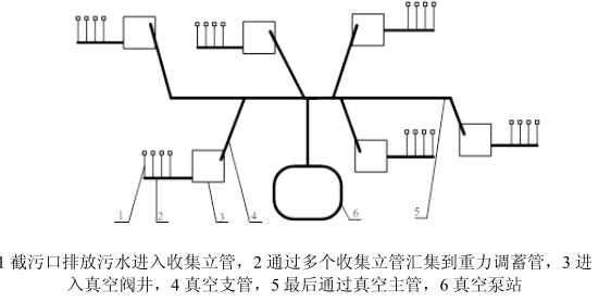 1截污口排放污水进入收集立管,2通过多个收集立管汇集到重力调蓄管,3进入真空阀井,4真空支管,5最后通过真空主管,6真空泵站