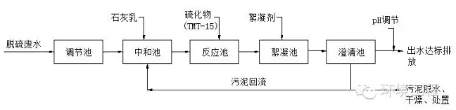 目前我国90%以上燃煤电厂采用了石灰石—石膏湿法烟气脱硫技术。在湿法烟气脱硫工艺中,为了维持系统稳定运行和保证石膏产品质,需要控制将液中Cl-浓度不能过高,因此需排出一部分浆液,从而产生脱硫废水。目前大多数电厂采用化学沉淀法处理脱硫废水,主要是通过氧化、中和、沉淀、絮凝等工艺去除脱硫废水中的重金属和悬浮物等污染。化学沉淀法工艺流程如图1所示。