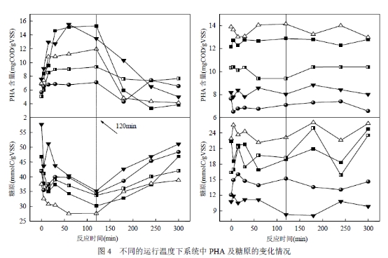 ÓÉͼ4(c)¿ÉÖªÌÇÔÔÚ120minµÄÏûºÄÁ¿´ïµ½×î´óÖµ,ÇÒ²»Í¬µÄÔËÐÐζÈÏÂÌÇÔµÄÏûºÄÁ¿²»Í¬,ÌÇÔµÄÏûºÄÁ¿ÓëϵͳµÄÔËÐÐζȾßÓÐÒ»¶¨µÄÏà¹ØÐÔ,µ«²¢²»Ê®·ÖÃ÷ÏÔ.×ÜÌåÀ´ËµËæ×ÅÔËÐÐζȵÄÉý¸ß,ÌÇÔµÄ×î´óÏûºÄÁ¿±íÏÖ³ö½µµÍµÄÇ÷ÊÆ.½øÈëºÃÑõ½×¶Îºó,¾ú½ºÍÅÖü´æµÄPHA¿ªÊ¼ÏûºÄ,¸÷ϵͳÄÚµÄPHAÖü´æÁ¿²»¶ÏϽµ,Óë´Ëͬʱ°ûÄÚÌÇÔ¿ªÊ¼»ýÀÛ.ËäÈ»PHAµÄÖü´æºÍÏûºÄÇé¿öÓëÌÇÔ¾ßÓÐÏà·´µÄÇ÷ÊÆ,µ«PHAºÍÌÇÔµÄÖü´æÁ¿ºÍÏûºÄÁ¿²îÒì½Ï´ó.ÌÇÔµÄÏûºÄÁ¿ºÍÖü´æÁ¿ÒªÔ¶Ô¶¸ßÓÚPHAµÄÖü´æÁ¿ºÍÏûºÄÁ¿.MinoÄ£ÐÍÈÏΪPHAµÄºÏ³ÉÄÜÁ¿À´Ô´ÓÚÌÇԵĽµ½â,ͬʱҲÓÐÎÄÏ×Ö¸³ö,PHAÖÁÉÙÓÐ30%µÄºÏ³ÉÄÜÁ¿¿ÉÄÜÀ´Ô´ÓÚÈýôÈËá(TCA)Ñ»·¹ý³Ì,Òò´ËPHAÖü´æºÍÌÇÔÏûºÄµÄ±ä»¯¹æÂÉ¿ÉÄܳöÏÖÓë±¾ÎIJ»Ò»ÖµÄÏÖÏó.ÓÉͼ4(b)ºÍ(d)¿ÉÒÔ¿´³ö,Ôڽ׶΢òµÄÔËÐÐÆÚ¼ä,ϵͳÄÚ²¢²»´æÔÚÃ÷ÏÔµÄPHAºÍÌÇÔµÄÖü´æºÍÏûºÄÏÖÏó,µ«²»Í¬µÄÔËÐÐζÈ,PHAºÍÌÇԵĻùÖµ²îÒì½Ï´ó.ÕâÊÇÒòΪ,½×¶Î¢ò²ÉÓó¤Ê±½øË®,ϵͳÁ÷̬ÀàËÆÍêÈ«»ìºÏʽ,¼´Ê¹´æÔÚȱÑõ½×¶Î,µ«ÏµÍ³Äڽϵ͵ĵ×ÎïŨ¶ÈÌݶȶԾú½ºÍŵÄÉú³¤²»Àû,˿״¾úÔڵ͵×ÎïŨ¶ÈÏÂѸËÙÉú³¤,µ¼ÖÂ5¸öϵͳ¾ù³öÏÖÎÛÄàÅòÕÍÏÖÏó.ÓÉ2.1½Ú¿ÉÖª,ϵͳµÄÔËÐÐζÈÔ½¸ß,ÎÛÄàµÄÅòÕͳ̶ÈÔ½ÑÏÖØ,ϵͳÄÚ˿״¾úµÄÖÖÀàºÍÊýÁ¿¾ÍÔ½¶à.ÓÉÓÚ¾ú½ºÍž߱¸Öü´æPHAµÄÄÜÁ¦¶ø¾ø´ó¶àÊýµÄ˿״¾ú²»¾ß±¸,ËùÒÔÎÛÄàµÄÅòÕͳ̶ÈÔ½ÑÏÖØ,˵Ã÷ϵͳÄÚµÄ˿״¾úÖÖÀàºÍÊýÁ¿Ô½¶à,ÔòϵͳÖü´æÄÜÁ¦Ô½µÍ.Òò´ËÔڽ׶΢òÖÐ,5¸öϵͳPHAºÍÌÇÔµÄÖü´æ»ùÖµ¾ùËæ×ÅÔËÐÐζȵÄÉý¸ß³ÊÏÖ³öϽµµÄÇ÷ÊÆ.