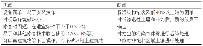 优缺点:当土壤细粒物质含量大,含水率高时,需要增大抽真空的能力,使修复费用增加;当土壤有机质含量高或极度干燥时,其对有机物的吸附容量大,SVE去除效率降低。