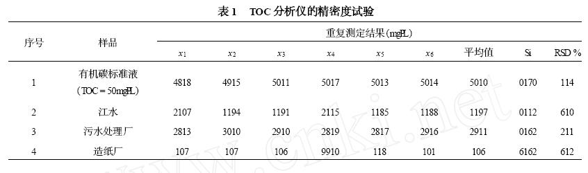 对由邻苯二甲酸氢钾配制而成的有机碳标准溶液(TOC=5010mgPL)和实际水样进行六次测试,标准偏差和变异系数见表1。