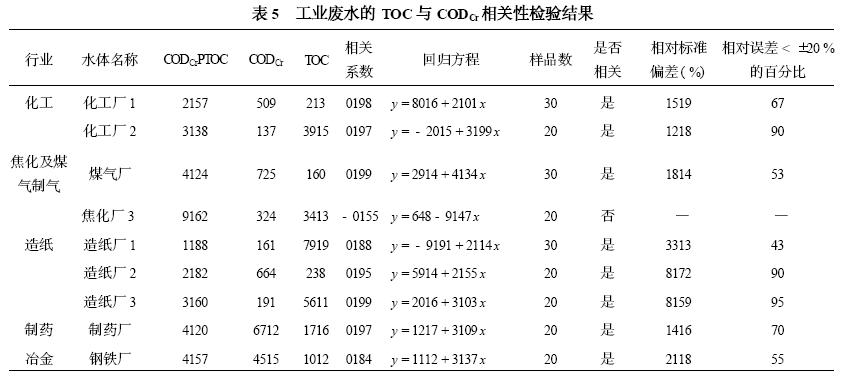 (3)通过对化工、造纸、制药、冶金等6个不同行业15种工业废水的测试,结果表明除焦化厂外,其余工业废水TOC与COD均具有明显的相关关系。