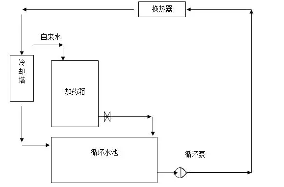 加药时用自来水稀释使用;采用连续加药方式,加药点在循环泵吸水口处,第一有利于药剂首先对换热器发生作用,第二有利于药剂持续均匀地发挥最大作用。