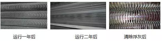 2、烟气流及所携带的大量烟灰亦会对凸于换热片表面的附着物产生冲刷作用,但当冲刷强度低于烟灰的粘结速率时,粘结附着物便会不断增长。而粘结物造成的通流面积的减少,又降低了烟气流的冲刷能力,导致恶性循环。