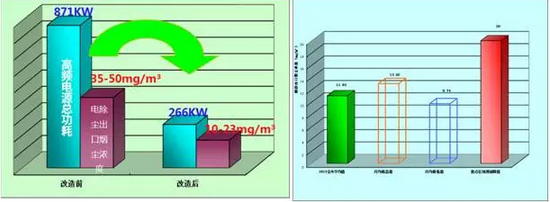 外三机组在技术改造后,电除尘出口烟尘浓度及高频电源总功耗显著降低。目前平均烟尘排放浓度11.03mg/m3,远低于新版标准的限额值。