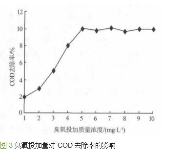 从图3可以看出,随着臭氧投加量的增加,COD去除率逐渐上升;当臭氧投加质量浓度达到5mg/L时,COD去除率达到最大(10%左右);随着臭氧投加量的增加,COD去除率不再有明显的变化,为了节约成本,选择5mg/L为臭氧直接氧化去除COD的最大投加质量浓度。
