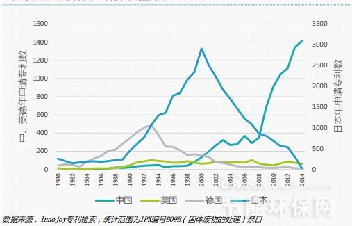2008年后,由于社会对环保问题的关注和基础设施投资建设潮的到来,我国固废处理行业迈入一个新的阶段(值得一提的是,在环保产业的诸多领域,2008都是较为特殊的一年,许多指标都有突出的增长,这与奥运带来的环保话题效应以及随之而来的治污举措不无关系)。工业危废、电子废弃物、餐厨垃圾等更加专业化和细分化的市场领域开始启动,快速增长的市场容量催生出了东江环保等技术色彩更浓的上市公司。固废处理领域的技术创新迎来了第二次爆发。目前,我国的年专利申请量已超过美、德、日等一众发达国家,全球固废领域技术创新最为活跃的国家。目前中国每年新申请的固废处理相关专利在1500个左右,这一数字依然在不断增长。我们在哪儿?根据中外垃圾处理政策导向与技术工艺发展趋势演进过程的对比,我国已走过了集中化处理、无害化处理率提升两个大趋势。目前的发展重点在填埋处理规模的取代、资源化利用的推进上,大致处于发达国家在90年代中期对固体废弃物的资源化利用的不断尝试与推进的时间节点。宇墨咨询认为,鉴于中国拥有极度广阔的垃圾处理市场需求以及尚有大量的填埋处理能力需要继续被替代,以及依然持续的核心处理设备的国产化需求,我国固废领域的技术创新还将保持5~10年的活跃期。