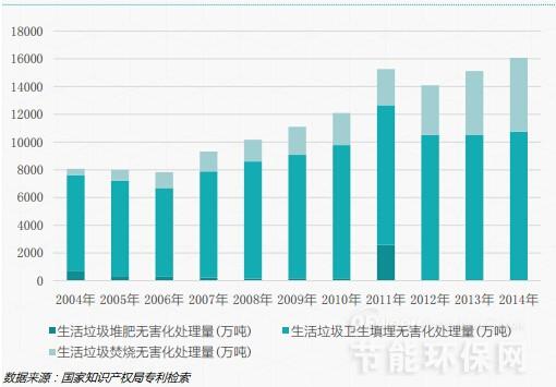2004-2014中国生活垃圾各工艺路线处理量对比