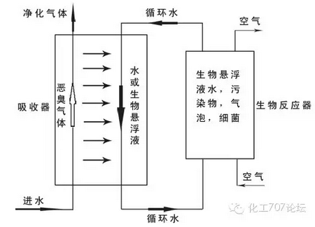脱臭原理:将恶臭物质和含悬浮物泥浆的混和液充分接触,使之在吸收器中从臭气中去除掉,洗涤液再送到反应器中,通过悬浮生长的微生物代谢活动降解溶解的恶臭物质