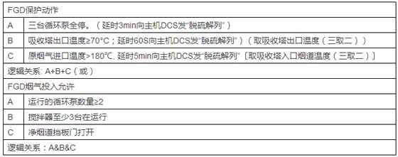 为防止锅炉尾部再燃等原因造成吸收塔内超温,对脱硫系统启、停及保护逻辑进行优化。还在塔入口烟道应增设事故冷却系统,和工艺水、消防水等相连,以保证在事故情况下保护塔内部件和衬里的安全。主要保护逻辑说明如下: