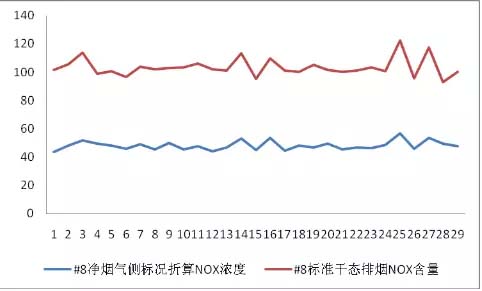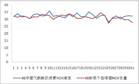 图3调整后SCR出口NOX与烟囱排烟NOX对照