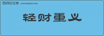 1、成语轻财重义出自汉·元王皇后《赐公孙弘子孙当为后者爵诏》:“股肱宰臣,身行俭约,轻财重义,较然著明。” 2、《北齐书·李元忠传》:“而犹家无担石,室