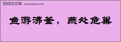1、成语鱼游沸釜出自清·南荃外史《叹老》:“傀儡儿一场热闹,依旧的鱼游沸釜,燕处危巢。” 2、傀儡儿一场热闹,依旧的鱼游沸釜,燕处危巢。见清·南荃外史《
